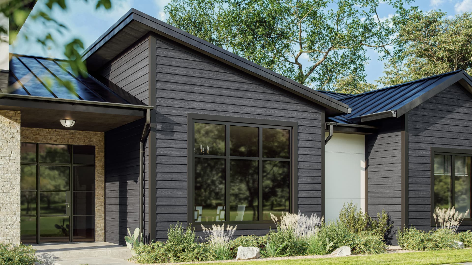 The TimberHue™ Collection features an array of color options— ranging from warm chestnuts to cool greys—reflecting today’s design trends while maintaining timeless appeal. Each of the eight colors was hand-selected by design experts to create a warm, welcoming exterior that feels both natural and elevated. Mix with other Hardie® products for a modern, mixed material aesthetic or used as an accent to highlight architectural features. Order a free sample below to see and feel the difference.